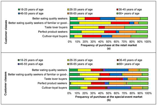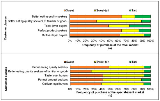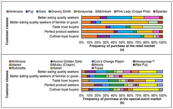 Figure 2 shows the apple cultivars selected by each class of customers at the retail market (a) and the special-event market (b). The characteristics of the five classes of customers are described below.