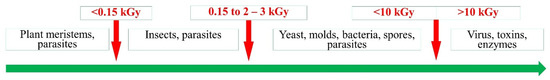 In addition to this presented information, it should be noted that bacterial toxins are highly radioresistant, with botulinic toxin having DRD values between 17 and 60 kGy and staphylococcal toxin between 27 and 95 kGy [38,63,64]. It is, therefore, obvious that when the toxin is already present in the food, usual ionizing treatments cannot be effective for its elimination.