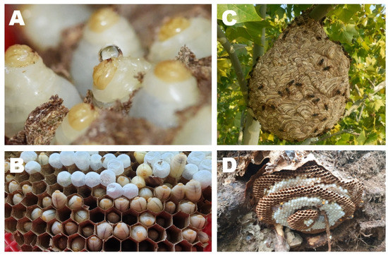 The nest of V. v. nigrithorax that hovers larvae. (A) Larvae of V. v. nigrithorax secreting saliva; (B) larvae of V. v. nigrithorax in cells; (C) the nest of V. v. nigrithorax hung on a tree; (D) the nest of V. mandarinia.