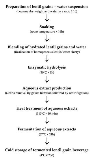 The increasing interest towards plant-based beverages, driven by the expansion of the market for food intolerance products, as well as for functional foods, has led scientific community to explore new matrices and bioprocessing protocol to provide a balanced profile [1,2,3]. Generally, water is used to extract the plant material, the addition of other ingredients, as well as several processing steps, such as heat treatments, fermentation and/or homogenization, are usually considered to prepare and formulate the final product [26]. In this study, three steps were optimized in order to set up the bioprocessing protocol for a lentil-based drink (Figure 1): enzymatic proteins hydrolysis from lentils slurry, heat treatment and fermentation with selected lactic acid bacteria.