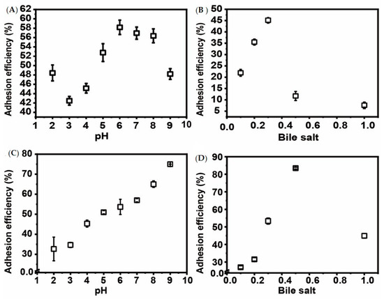 Effects of pH: to determine the adhesion efficiency of P. aeruginosa PAO1 by G. candidum LG-8 under different pH conditions, the pH of the solution containing the cells was adjusted to 2.0–9.0 with 1 M HCl or 1 M NaOH. Moreover, the influence of oxgall bile salts on the bacterial adhesion efficiency was studied. Both bacterial and fungal cells were diluted in the same saline solution containing 0.1%, 0.2%, 0.3%, 0.5%, or 1% (w/v) oxgall bile salts. The remaining assays were performed according to methods described in Section 2.2 “P. aeruginosa PAO1 adhesion assays”.