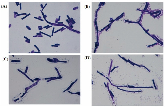 After evaluation about effects of LG-8 viability on P. aeruginosa adhesion in Section 2.3, G. candidum LG-8 cells treated with P. aeruginosa cells were dyed according to the Gram staining method and observed by optical microscopy. G. candidum LG-8 untreated with P. aeruginosa was the control group.