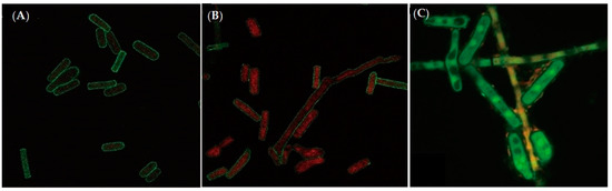 Additionally, some green fungal cells with large orange spots (Figure 3C) were observed, which were reported to be compromised cells by Kuyukina et al. [20,28]. Adhesion of red, green, and orange bacterial cells to the compromised fungal cells indicated that dead, living, and compromised bacterial cells were adhered to the compromised cells. The visible surfaces and edges of LG-8 cells treated with PAO1 (Figure 3C) emitted bright green fluorescence, while the control group (Figure 3A,B) showed weak green-fluorescent edges, indicating that the polysaccharide on the surface of LG-8 increased after treatment with P. aeruginosa PAO1.