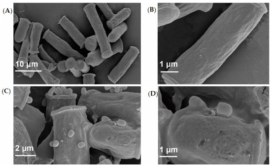 SEM images were obtained to show the morphological characteristics of cells visually and evaluate the adhesion between P. aeruginosa PAO1 and G. candidum LG-8 cells via magnified visualization. As shown in Figure 4A,B, the LG-8 cells untreated with P. aeruginosa PAO1 were structurally intact, plump, and drum shaped. The edges were neat, while the surfaces were smooth. After treatment with P. aeruginosa PAO1 (Figure 4C,D), small holes appeared on the fungal surfaces. Furthermore, the fungal edges, especially the sites of trapping the bacteria, were irregular. The envelope-like edge (Figure 4D) is associated with the capsule (Figure 1B) visualized by a normal microscope in this study. Regardless of adhesion occurring among LG-8 cells or between LG-8 cells and the bacteria, LG-8 cells were coated in a syrup-like substance. The syrup-like EPS was speculated to be polysaccharide, which was also visualized by LSCM analysis in this study.