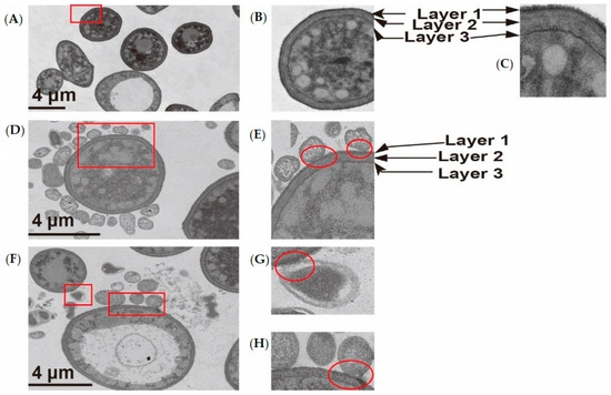 Visualization by transmission electron microscopy (TEM). (A,B): TEM micrographs of G. candidum LG-8 untreated with P. aeruginosa PAO1; (D–H): TEM micrographs of G. candidum LG-8 treated with P. aeruginosa PAO1; Notes: (B,C,E,G,H) were obtained from the red boxed fields of (A,D,F) at magnification, respectively.