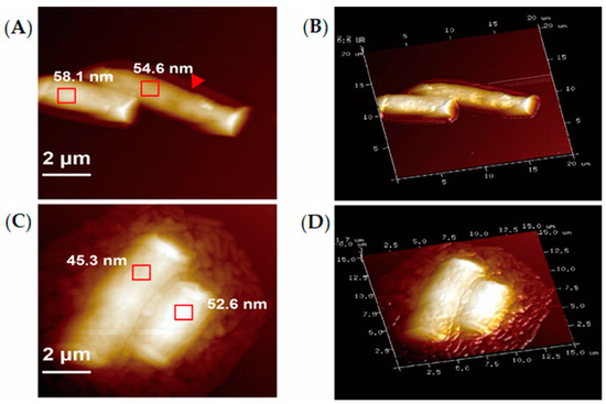 For unsterilized G. candidum LG-8 (Figure 6A,B) untreated with P. aeruginosa PAO1, the morphological characteristics were consistent with the results by SEM. The flattened structures surrounding the LG-8 cells observed by optical microscopy and SEM were also observed by AFM (Figure 6A, red arrow). It has been previously reported that the flattened structure is the cell wall undergoing the dry process [33]. Our high-resolution AFM images (Figure 6C,D) provided compelling evidence of bacterial cell adhesion onto the surfaces of the fungus LG-8. The morphology of the fungi (Figure 6C,D) after treatment with PAO1 did not change significantly. However, the Ra of selected areas in G. candidum LG-8 cells decreased from 54.6 and 58.1 nm (Figure 6A, red rectangle) to 45.3 and 52.6 nm Figure 6B, red rectangle) after treatment with the bacteria.
