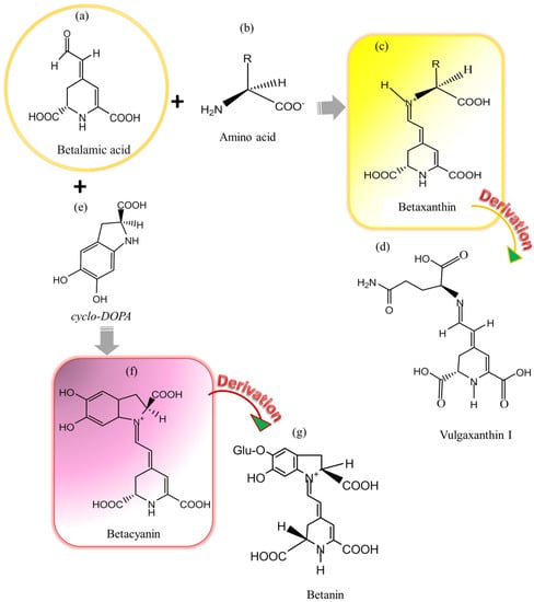 Derivation of betacyanin and betaxanthin color compounds from betalamic acid: (a) Betalamic acid which is core structure of betalain, (b) Amino acid which conjugates with betalamic acid to derive betaxanthin, (c) Yellow color giving betaxanthin, (d) Vulgaxanthin I which is a derivative of betaxanthin, (e) cyclo-DOPA which condenses with betalamic acid to give betacyanin, (f) Red-violet color giving betacyanin, and (g) Betanin which is a derivative of betacyanin [2,5,14,27,28,37,42].