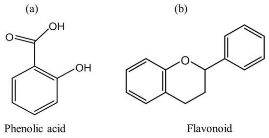 Basic structures of phenolic compounds: (a) Backbone structure of phenolic acid, and (b) Structure of flavonoid moiety [21,31].