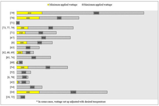 Heating mode, duty cycle, power or heat energy, and temperature in an advanced microwave set up are basic operational parametric modes in MAE of betalains and phenolic compounds. Response surface methodology (RSM) is a suitable tool to approach the efficiency of MAE through the interaction of process variables despite the fact that the predicted values estimated by the model are only within the experimental limit [9,18,62,63,67,68,69,70,71,72,73]. Central composite design was mostly chosen for the investigation of each or parallel effects of process variables on the corresponding response. Based on the response level whether high or low, the weight of the factor on the response could be judged. Here again, the levels of the factors optimized by RSM support to be in between, i.e., neither at most nor lowest level or else the performed limits are regarded as insufficient for the design to fully predict the optimum condition of the variables within those limits [26]. For example, it can be said that the model well predicted the optimum condition of the extraction process if the highest amount of total phenolic compounds (39 mg GAE/gDW) was achieved at ethanol concentration (31.33%), solvent to material ratio (32.21 mL/g), temperature (52.24 °C) among the variables which were ethanol concentration (20–40%), solvent to material ratio (20–40 mL/g), temperature (40–60 °C) [73]. Table 3 and Table 4 represent some reported optimum conditions, within experimental variable ranges, for the extraction of betalains and phenolic compounds from fruit and vegetable as well as their wastes. In advance, some example of power output and time setting to accomplish MAE of secondary plant metabolites are demonstrated in Figure 4 and Figure 5.