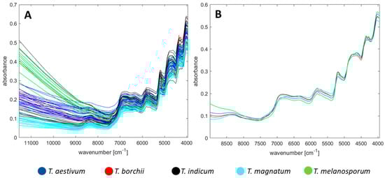 Figure 1A shows all untreated spectra of the raw data, coloured in accordance to the different truffle species. As anticipated and seen from Figure 1A, the absorbance rises towards lower wavenumbers because of the transition probability which is higher for the first transition than for higher overtones [46].