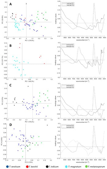 Principal component analysis (PCA) score-plots with their respective loadings plots after pre-processing approach No. i of (A) all five truffle species, (B) only white truffle species, and only black truffle species in the (C) PC2 vs. PC1 plane and (D) in the PC4 vs. PC2 plane.