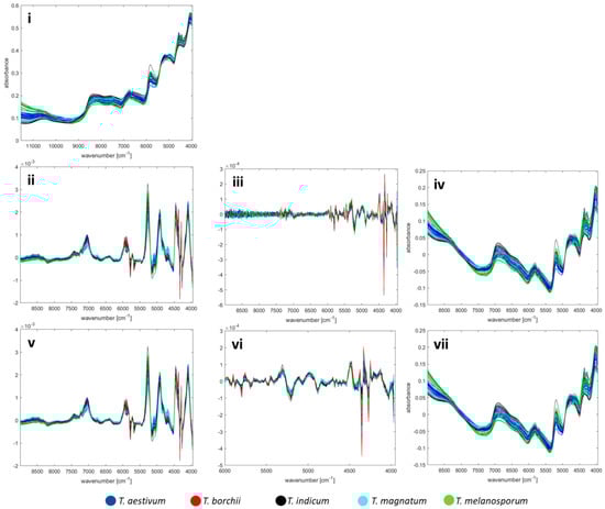 Spectra comparison of different pre-processing approaches, also refer to Table 1. First row: one-step pre-processing: (i) MSC. Second row: two-step pre-processing: (ii) MSC, 1st derivative. (iii) MSC, 2nd derivative. (iv) MSC, detrending. Third row: three-step pre-processing: (v) smoothing, MSC, 1st derivative. (vi) Smoothing, MSC, 2nd derivative. (vii) Smoothing, MSC, detrending.