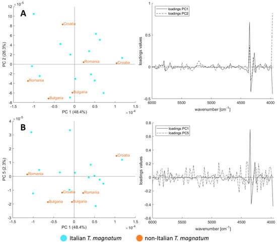 PCA score-plots with their respective loadings plots after pre-processing approach No. vi of the T. magnatum samples from Italy and other countries (A) PC2 vs. PC1, (B) PC5 vs. PC1.