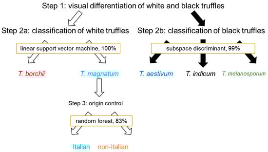 As the results show, FT-NIR can be used for the differentiation of black and white truffles, and Italian and non-Italian truffles of the species T. magnatum. Since FT-NIR is a simple and cheap method, it is suitable for industrial applications, for example, for the incoming goods inspection or authenticity checks on truffles. The process of authentication using FT-NIR is shown schematically in Figure 5.