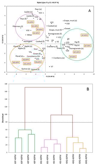 - Partial products in appropriate proportions preparation: purée and juices samples, immediately after their preparation, were mixed in the proportions 40:60 (40F:60 PM; 40F:60PW; 40J:60 PM; 40J:60PW; 40Q:60 PM; 40Q:60PW) and 60:40 (60F:40 PM; 60F:40PW; 60J:40 PM; 60J:40PW; 60Q:40 PM; 60Q:40PW), obtaining 12 samples. Then, the products were heated to 100 °C, put into glass jars (130 mL) and pasteurized (10 min at 90 °C).