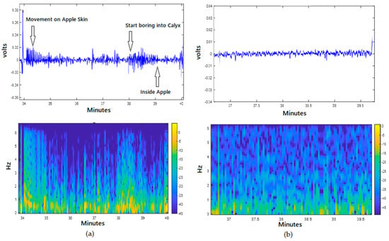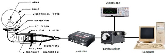 - Ekramirad, N.; Chadwick, A.P.; Villanueva, R.T.; Donohue, K.D.; Adedeji, A.A. Low Frequency Signal Patterns for Codling Moth Larvae Activity in Apples. 2020. Available online: https://elibrary.asabe.org/abstract.asp?aid=51527 (accessed on 25 June 2020).