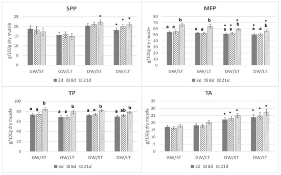 Effects of farm origin, transport time, and ageing time on sarcoplasmic (SPP), myofibrillar (MFP), total protein (TP) and total amino acids (TA) (g 100 g−1 dry muscle) contents of goat kids’ Longissimus thoracis muscle. Asterisks indicate significant differences attributable to farm origin (p < 0.05). Different letters show significant differences attributable to post-mortem time (p < 0.05). Values are average ± se. GW: high welfare-friendly management farm; DW: low welfare friendly management farm; ST: short transport; LT: long transport; 3d: 3 days post-mortem (dpm); 8d: 8 dpm; 21 d: 21 dpm. Significance of the three effects: SPP: p < 0.001 for farm origin; rest not significant. MFP: p < 0.01 for farm origin; p < 0.001 for ageing time; rest not significant. TP: p < 0.05 for transport duration; p < 0.01 for ageing time; rest not significant. TA: p < 0.001 for farm origin; rest not significant. Interactions: were not significant.