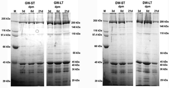 Effect of farm origin, transport duration, and ageing time on SDS-PAGE separation of sarcoplasmic protein (SPP) extracts. GW: high welfare-friendly management farm; DW: low welfare friendly management farm; ST: short transport; LT: long transport; 3d: 3 days post-mortem (dpm); 8d: 8 dpm; 21d: 21 dpm. M, molecular mass marker.