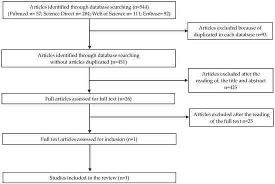 A total of 1978 results were obtained: 544 for microbiological risk, 456 for chemical risk, 386 for physical risk, and 592 for allergenic risk. The screening by title, abstract, and full text was made, and after removing duplicates between the four databases, 14 articles were selected as the sum of the results of all the search strings. Of these 14 selected works, seven were laboratory research studies, four were case reports, two were trials, and one was a descriptive study. An article entitled “Eating jellyfish: safety, chemical, and sensory properties” was found three times using search strings for microbiological, allergenic, and chemical risk [17].