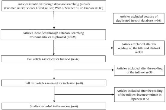 Analyzing the countries where the studies were made, the publication concerning microbiological risk was conducted in Portugal; for the allergenic risk, three studies were conducted in Japan, one in China and two in Portugal. As for the articles concerning chemical risk, three articles were conducted in China, one in Portugal, one in Spain, one in Australia, and one in Malaysia. No articles were found for physical risk. Flow charts related to microbiological, allergenic, and chemical risks are shown in Figure 1, Figure 2 and Figure 3, respectively.