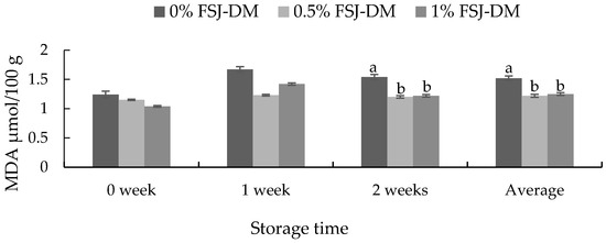 The effects of FSJ-DM supplementation on the meat oxidative stability of KNBG are presented in Figure 1. On an average (0–2 weeks) and after 2 weeks of storage, the TBARS value of meat samples from animals supplemented with FSJ-DM was significantly lower (p < 0.05) than that from other groups.