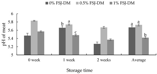 On an average (0–2 weeks) and after 1 week of storage, the pH of KNBG meat was significantly lowered in the 1.0% FSJ-DM supplemented group (p < 0.05). However, no differences were observed after 0 and 2 weeks of storage (Figure 2).