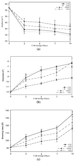 Consumers a choose fresh-cut fruit by primarily considering its aspect and color. In all our samples, the brightness of the flesh (L*) decreased during the storage time, but the results were affected by the use of edible coatings. Considering the initial L* values of the fresh and untreated kiwi slices, after two days of storage, all the treatments suffered a rapid decline in this value, probably due to the low storage temperatures (Figure 1a). However, the HPMC and LEO treatments resulted in fewer changes in brightness than the CTR and AVG, which showed similar behaviors throughout the storage times and became browner than the others. Similar results were obtained for apple slices from Farina et al. [27] and Chauhan et al. [48], which showed that the samples treated with Aloe vera gel only were lower than the other treatments, while maintaining high-quality apple slices compared to the control. As regards results specifically on kiwifruits, Agar et al. [1] reported a similar reduction in brightness when the kiwi slices were stored with MAP (modified atmosphere packaging) technology.