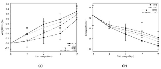 Weight loss is closely related to the firmness of the fruit, due to the consumers’ acceptability [53]. In Figure 3a, CTR and AVG-treated kiwi slices differed from the HPMC and LEO treatments due to a greater weight loss during the storage period. In fact, after ten days of storage, the untreated kiwi slices lost 1.30% of the weight, AVG 1.25%, HPMC 0.96% and LEO 1.16%.