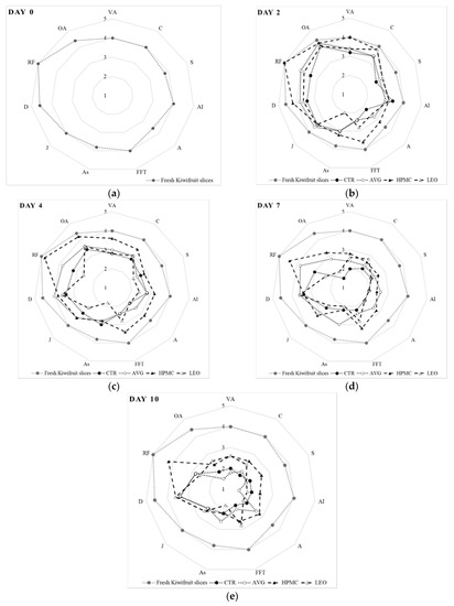 From day two of the storage (Figure 4b), the kiwi slices started to show a decrease in visual appearance (VA) values. This behavior was probably due to an appearance that is no more intact and homogeneous, as on day 0. In particular, the CTR and AVG had values close to 2 at the end of the storage period, which indicated that the product was commercially unacceptable according to the judges. The highest values, on the other hand, were given to the HPMC and LEO, which maintained the appearance of the kiwi slices almost unchanged (2.6). The parameter that most deviated from the average values was the degree of astringency (As) for the LEO treatment (2), because already from the second day of storage, the judges detected the taste of lemon essential oil that covered the taste of kiwifruit, according to Perdones A. et al. [42], who found that the typical strawberry aroma and taste was masked by the chitosan and lemon essential oil coating.