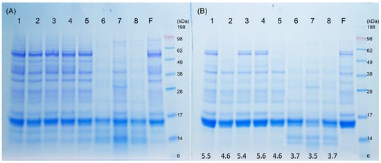 The yeast doughs and sourdoughs were lyophilized and grounded in a mortar. An aliquot of 2 g dried dough flour was extracted with 150 mM NaCl at ambient temperature to separate the albumin/globulin fraction of the dough flour. The protein solution was also heated at 60 °C for 30 min to inactivate beta-amylases and then the supernatant was dialyzed against water to remove the salt by a membrane cut-off of 3.5 kDa. Followed by lyophilization, the albumin/globulin fraction of dough flour before and after heat treatment were analyzed by SDS-PAGE. Wheat flour as control was treated as described before. The dried samples were mixed with 4× lithium dodecyl sulfate (LDS) sample buffer and 10× sample reducing agent and boiled for 3 min and separated on NuPage Bis-Tris 10% gel with MES (2-(N-morpholino)ethanesulfonic acid) SDS running buffer (Invitrogen, Thermo Fisher Scientific, Waltham, MA, USA). Novex Sharp pre-stained protein standard (LC5800) or SeeBlue Plus2 Pre-stained standard (LC5925, Thermo Fisher Scientific) served as molecular markers (myosin 198 kDa, phosphorylase 98 kDa, bovine serum albumin 62 kDa, glutamic dehydrogenase 49 kDa, alcohol dehydrogenase 38 kDa, carbonic anhydrase 28 kDa, myoglobulin 17 kDa, lysozyme 14 kDa, and aprotinin 6 kDa). Running condition was 200 V for 35 min. The gel was stained by Commaasie Brilliant Blue R-250.