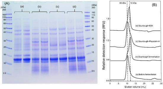 The sourdough contained 250 g flour, 250 g water, and 15 g rye sourdough starter in the presence of 20 µM aspartic protease inhibitor Pepstatin-A or 10 µM cysteine protease inhibitor E-64, (1