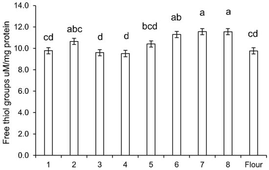 The albumin/globulin fraction of 9 mg freeze-dried dough flour was completely dissolved in 1 mL of 5% sodium dodecyl sulfate (SDS), 0.1 M Tris-HCl, pH 8.0, buffer at 60 °C for one hour. 100 µL of the solution was diluted with 900 µL 0.1 M Tris-HCl, pH 8.0, and mixed with 50 µL 10 mM DTNB (Ellman’s reagent, 5,5-dithio-bis-(2-nitrobenzoic acid)). Absorbance at 412 nm before and after adding DTNB was measured. Protein concentration was determined at 280 nm. The thiol content was calculated using molar extinction coefficient Δε412 = 14,150 M−1 cm−1, and expressed as µM/mg protein. Each assay was performed in triplicates.