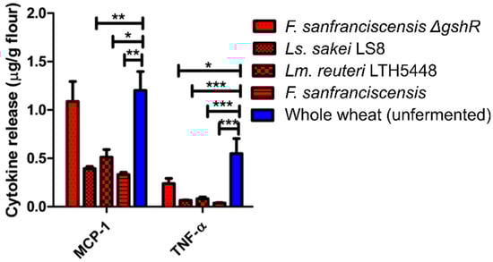 14]. Protein content was measured using the bicinchoninic acid assay (Thermo Fisher Scientific, Bonn, Germany). The two extractions were combined, diluted in phosphate-buffered saline (PBS) or cell culture medium, and extracts with 10–250 µg protein/mL were added to mycoplasma-free cultures of ATI-reactive (TLR4-bearing) human THP-1 monocytes cells (TIB-202, ATCC, Wesel, Germany), seeded at densities of 2 × 105 to 1 × 106/mL in 0.2 to 1 mL medium in 96- or 24-well culture plates. An extract of a standard commercial wheat flour, bacterial lipopolysaccharide (LPS), or a blank control served as positive and negative controls, respectively. After a 0.5–16 h incubation, chemokines and cytokines released into the medium were quantified with validated enzyme-linked immunosorbent assays (ELISAs) for CCL2/MCP-1 and TNF-α (BD, Heidelberg; eBioscience, Frankfurt, Germany; R&D systems, Minneapolis, MN, USA).