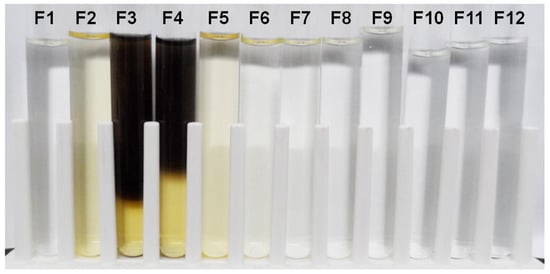 The fruiting body extract fractions (F1–F12) eluted from an ion-exchange column, DEAE-Sepharose, in the edible mushroom Hericium erinaceus, with dark brown pigments in F3 and F4.