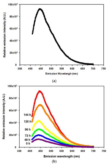 An alternative method, fluorescence spectroscopy, was used to detect the brown pigmentation. The fractions with dark brown pigment were scanned. To determine the optimum emission and excitation wavelength for the pigment, the emission wavelength (Em) was fixed at 460 nm and the excitation (Ex) spectra ranged from 250 to 420 nm was scanned. The highest fluorescence was obtained at 380 nm as the optimal emission wavelength. The excitation wavelength was then fixed at 380 nm, and the emission spectra were scanned from 420 to 700 nm. The maximum intensity signal was detected at the emission wavelength at 444 nm (Figure 2a) setting the excitation wavelength at 380 nm. The emission intensity of each sample corresponded to the relative amount of brown pigmentation, which formed in a time-dependent manner (Figure 2b).
