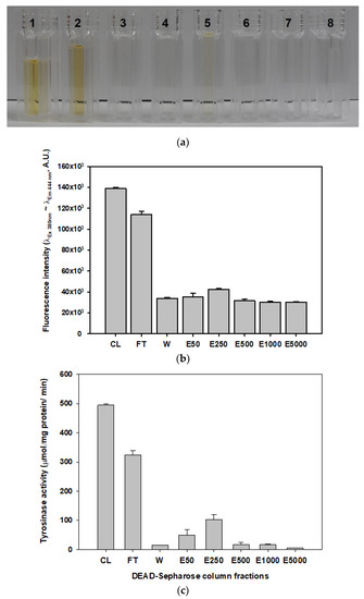 Measurement of the browning pigment substances and tyrosinase activities in the fraction pools collected in the DEAE-Sepharose column. (a) The protein fraction pools eluted from the DEAE-Sepharose column: 1, crude extract fraction pool (CL); 2, flow-through fraction pool (FT); 2, wash fraction pool (W); 4–8, elution fraction pools with 50 mM (E50), 250 mM (E250), 500 mM (E500), 1000 mM (E1000), and 5000 mM NaCl (E5000), respectively, in 50 mM Tris-HCl buffer. (b) Fluorescence intensities (Arbitrary Unit, A.U.) of these fraction pools for the measurement of brown pigment under the optimum conditions with λEx380 nm~λEm460nm. (c) Tyrosinase-specific activities of these fraction pools under the enzyme assay conditions described in the material and method section.