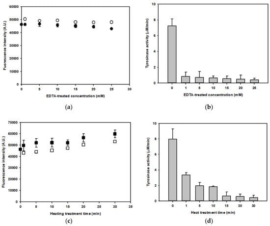 Measurement of fluorescence intensities and tyrosinase activities in the mushroom lysate treated with EDTA or heat. (a) Fluorescence intensities of the EDTA-treated lysates at the initial time (black circles) and 14 days later (white circles). (b) Total tyrosinase activities of EDTA-treated lysates. (c) Fluorescence intensities of the heat-treated lysates at the initial time (black squares) and 14 days later (white squares). (d) Total enzyme activities of the heat-treated lysates. Fluorescence intensities (Arbitrary Unit, A.U.) and tyrosinase activities of all fractions were measured under the optimum conditions with λE × 380 nm~λEm 460 nm and the enzyme assay conditions described, respectively.