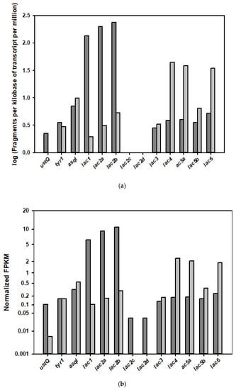 Transcription levels of tyrosinase- and laccase-coding genes involved in the enzymatic browning reaction in the fruiting body (dark gray) and the mycelium (gray-white) of H. erinaceus. (a) Log scale for transcription levels expressed as fragments per kilobase of transcript per million (FPKM). The log (FPKM) values of lac2c and lac2d were less than −0.1. (b) Normalized FPKM values relative to a suite of endogenous actin genes in each growth phase.
