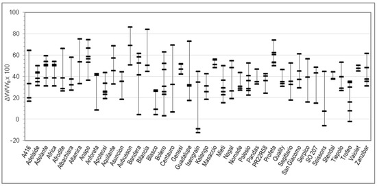 Considering the great variability observed in the quality parameters in Table 1 and in order to better understand the relationship between genotype and rheological behaviour of dough without and with salt, for each Alveograph and Farinograph parameter we reported also the percent relative difference registered by using salt-free and salted water for each analyzed sample in each cv. For each cv. we measured from three to six samples, coming from different cultivation areas. The W, P, and L parameters are studied in Figure 1, Figure 2 and Figure 3, respectively, whereas the water absorption (WA), development time, stability, and softening 12′ in Figure 4, Figure 5, Figure 6 and Figure 7, respectively. In these Figures, vertically aligned dash marks represent samples of the same cultivar. Dash marks below the zero line represent a decrease, whereas above the zero line represent an increase and next to the zero line mean substantially no variation (with respect to the parameter without salt). If the dash marks are close, it means that the relative variation of the parameter was similar for all samples of that cultivar. This was not the case for all cultivars because the analyzed parameters can also be influenced by sample growing conditions.