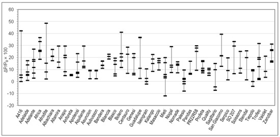 Percent relative difference between the Alveograph P registered by using salted water and the P registered by using distilled water (ΔP/P0 × 100 = (Pwith salt − Pwithout salt)/Pwithout salt × 100), for 176 samples of 41 soft wheat cvs (each dash on the graph represents the ΔP/P0 × 100 of a sample. Vertical lines join samples of the same cultivar).