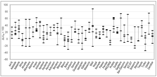 Percent relative difference between the Alveograph L registered by using salted water and the L registered by using distilled water (ΔL/L0 × 100 = (Lwith salt − Lwithout salt)/Lwithout salt × 100), for 176 samples of 41 soft wheat cvs (each dash on the graph represents the ΔL/L0 × 100 of a sample. Vertical lines join samples of the same cultivar).