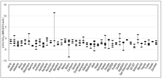 Percent relative difference between the Farinograph water absorbance (WA) 14% m.b. registered by using salted water and the WA 14% m.b. registered by using distilled water (ΔWA/WA0 × 100 = (WAwith salt − WAwithout salt)/WAwithout salt × 100), for 176 samples of 41 soft wheat cvs (each dash on the graph represents the ΔWA/WA0 × 100 of a sample. Vertical lines join samples of the same cultivar).
