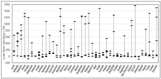 Percent relative difference between the Farinograph development time registered by using salted water and the dev.time registered by using distilled water (Δdev.time/dev.time0 × 100 = (dev.timewith salt − dev.timewithout salt)/dev.timewithout salt × 100), for 176 samples of 41 soft wheat cvs (each point on the graph represents the Δdev.time/dev.time0 × 100 of a sample. Vertical lines join samples of the same cultivar).
