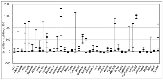 Percent relative difference between the Farinograph stability registered by using salted water and the stability registered by using distilled water (Δstability/stability0 × 100 = (stabilitywith salt − stabilitywithout salt)/stabilitywithout salt × 100), for 176 samples of 41 soft wheat cvs (each point on the graph represents the Δstability/stability0 × 100 of a sample. Vertical lines join samples of the same cultivar).
