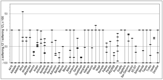 Percent relative difference between the Farinograph softening (12 minutes after maximum) registered by using salted water and the softening registered by using distilled water (Δsoftening12′/softening12′0 × 100 = (salt softening12′with salt − softening12′without salt)/softening12′without salt × 100), for 176 samples of 41 soft wheat cvs (each point on the graph represents the Δsoftening12′/softening12′0 × 100 of a sample. Vertical lines join samples of the same cultivar).