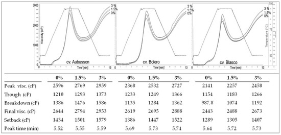 Flours obtained from grains of the cvs. Aubusson, Bolero, and Blasco, which are widely used in breadmaking in Italy and considered respectively as possessing weak, intermediate, and strong gluten, were also tested for their pasting properties by means of a RVA (Rapid Visco Analyzer) (Perten Instruments, Stockholm, Sweden) according to ICC Method n. 162, Standard 1 profile [27]. For each flour, the test was repeated according to a modified Standard 1 procedure in this way: 1.5% or 3.0% salt was added with respect to flour weight (the original procedure is without salt). The following parameters were measured: peak time, peak viscosity, through viscosity, viscosity breakdown, set back, and final viscosity.