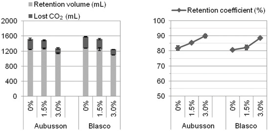 Retention volume, lost CO2, total volume *, and retention coefficient during fermentation without salt and at 1.5% and 3.0% salt addition for cvs. Aubusson and Blasco, respectively. * total volume = retention volume + lost CO2.