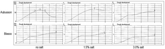 The dough development profiles during fermentation of the Aubusson and Blasco flours presented in Figure 10 show that without salt, the dough made from the weak Aubusson cv. rose to a maximum height first, then deflated sensibly. The dough made from the strong Blasco cv. rose continuously, with a pause (shoulder) but without deflating and reached a final height that was also its maximum height. The addition of 1.5% salt strengthened the Aubusson dough, that did not deflate sensibly anymore and its maximum height, which was like the one without salt, occurred later. On the contrary, there was no appreciable effect on the final height of the Blasco dough (the shoulder was slightly delayed and increased). At 3.0% salt addition, the profile of the Aubusson dough changed completely and became like that of the Blasco dough with no salt or 1.5% salt (rising continuously with a shoulder), whereas the Blasco dough became too tenacious and rose less than with no salt or 1.5% salt.