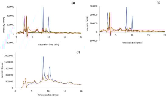 The chromatographic profile of the different algae extracts with water at room temperature (Figure 1b) is very similar to the results of the extraction with hot water (Figure 1a). In both situations the ocean sample showed the highest number of compounds (9) together with the highest intensities. Comparing both temperatures of extraction for the ocean samples, the peaks at 8 and 10 min have higher intensities, (268001 mUA and 170,626 mUA at 100 °C and 252,534 mUA and 162,551 mUA at 25 °C, respectively) that is an increase of 6 and 5% of area, respectively, when the extraction is carried out with boiling water. Therefore, each temperature of extraction leads to similar profiles, but the extraction at 100 °C produces higher intensities of compounds.
