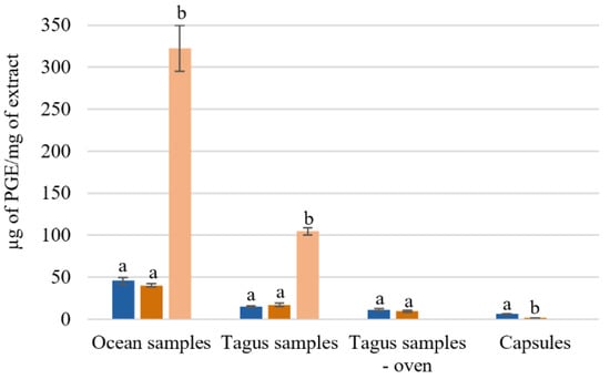 Total phenol content of Fucus vesiculosus extracts obtained by different aqueous extraction processes. Total phenolic content (µg of PGE/mg of extract); different superscript letters (a,b) correspond to values in the same extraction condition that can be considered statistically different (p ≤ 0.05). (